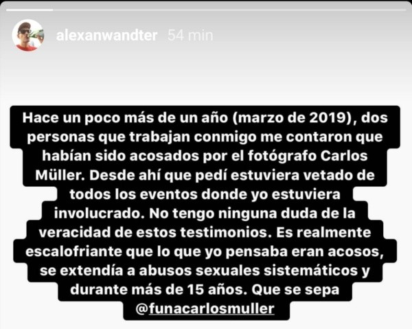 Y uno de los más ácidos fue Álex Anwandter, quien recalcó que “hace poco más de un año, dos personas que trabajan conmigo me contaron que habían sido acosados por el fotógrafo Carlos Müller. Desde ahí que pedí que estuviera vetado de todos los eventos donde yo estuviera involucrado. No tengo ninguna duda de la veracidad de estos testimonios”, expresó.