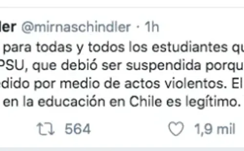 El intercambio se dio en Twitter, donde Schindler extendió “mi solidaridad para todas y todos los estudiantes que no han podido rendir hoy su PSU, que debió ser suspendida porque un grupo minoritario se los ha impedido por medio de actos violentos”.