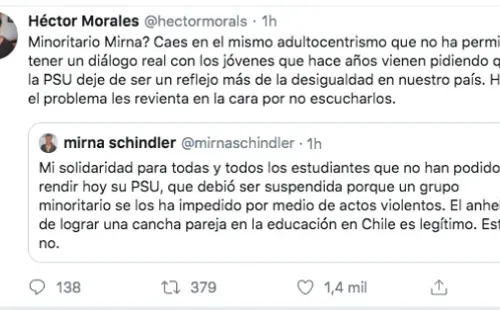 No pasó mucho tiempo para que Héctor Morales apareciera en el escenario y condenara el reproche de Schindler, planteando que “caes en el mismo adultocentrismo que no ha permitido tener un diálogo real con los jóvenes que hace años vienen pidiendo que la PSU deje de ser un reflejo más de la desigualdad en nuestro país”.