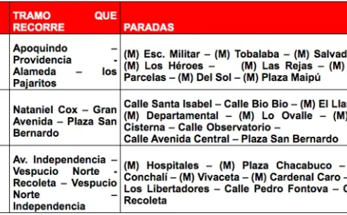 Aquí el detalle de los buses de apoyo, donde se indica a qué recorrido y/o línea de Metro apoyan y el tramo que recorrerá: