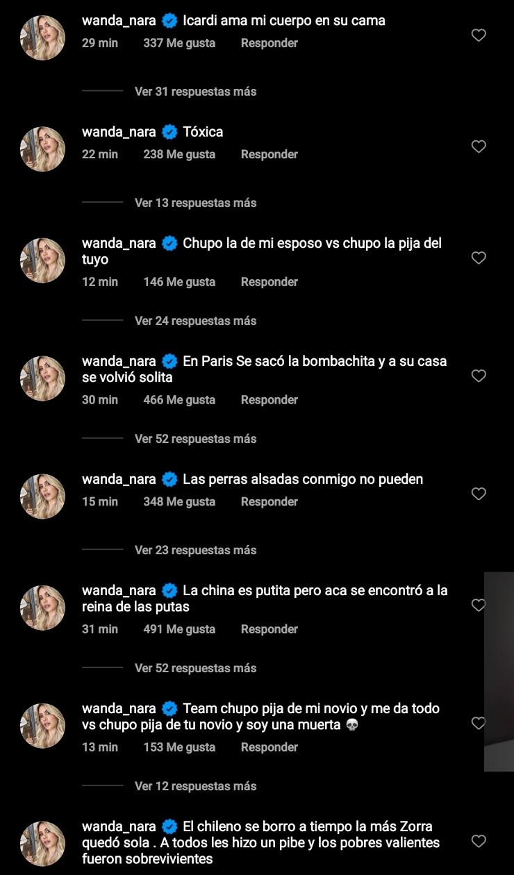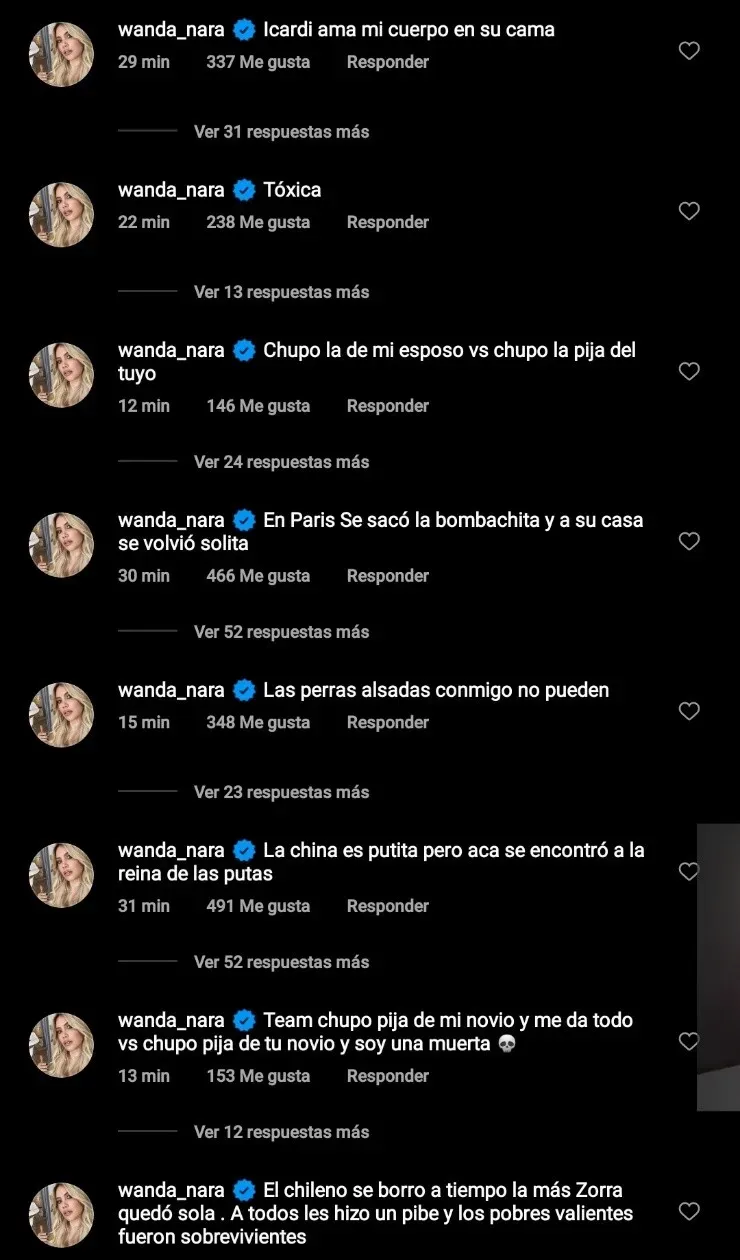 La animadora y representante de futbolistas volvió a la palestra luego de que desus redes oficiales (@wanda_nara) surgiera una serie de respuestas a sus seguidores -algunos bastante ofensivos-, comentarios xxx y además una durísima crítica contra María Eugenia Suárez.