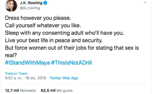 La autora salió en defensa de una investigadora llamadaMaya Forstater, quien hizo múltiples publicaciones en la misma red social, en las que manifestó que las mujeres trans tienen la imposibilidad de cambiar su sexo biológico y otro tipo de leyendas ofensivas para para la comunidad LGBTQI+.