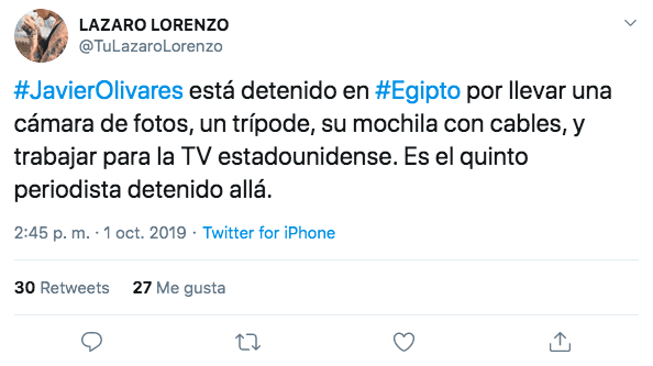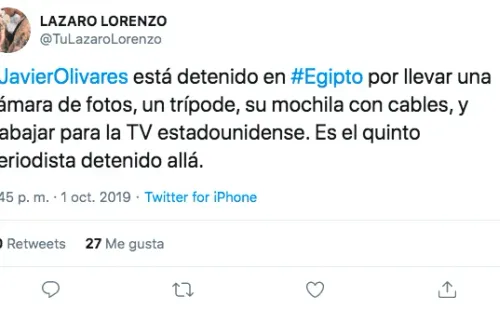 La publicación en la cuenta verificada apuntó que “estoy raptado y detenido en Egipto por la Policía, este es mi tercer día y solo ahora puedo tener unos minutos mi teléfono”.