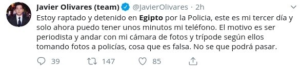 Una curiosa situación se vivió en el timeline de Twitterde Javier Olivares la mañana de este jueves, después de que el periodista denunció estar “raptado” por la Policía en Egipto.