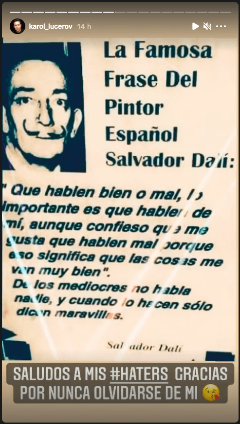 Horas más tarde, Karol Lucero reaccionó irónicamente ante quienes lo cuestionaron por su comentario, respondiendo con una cita de Salvador Dalí: “Que hablen bien o mal, lo importante es que hablen de mí, aunque confieso que me gusta que hablen mal porque eso significa que las cosas me van muy bien. De los mediocres no habla nadie, y cuando lo hacen sólo dicen maravillas”.