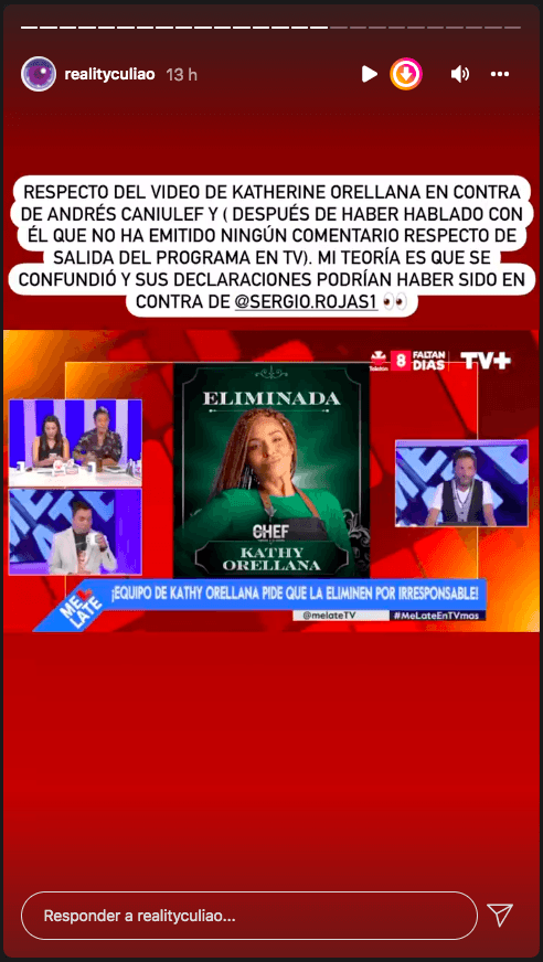 Desde la cuenta @realityculiao, indicaron que “respecto del video de Katherine Orellana en contra de Andrés Caniulef y después de haber hablado con él, que no ha emitido ningún comentario respecto de la salida del programa de TV”.