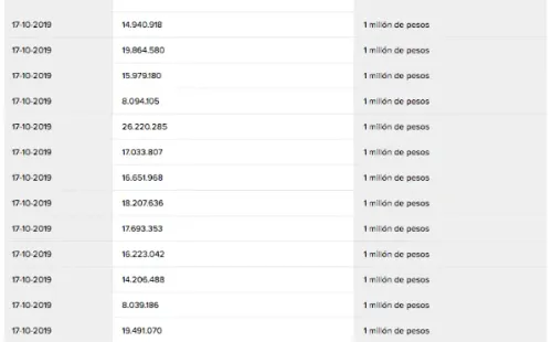 Se realizarán 57 sorteos, entre el 17 y el 30 de octubre, entre los que se entregarán85 millones de pesos, repartidos de la siguiente manera: 50 premios de unmillóny 7 por el monto de 5millones.