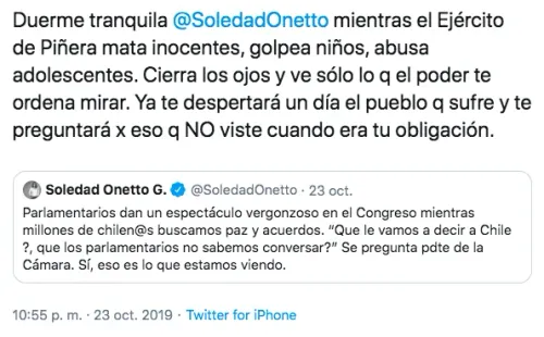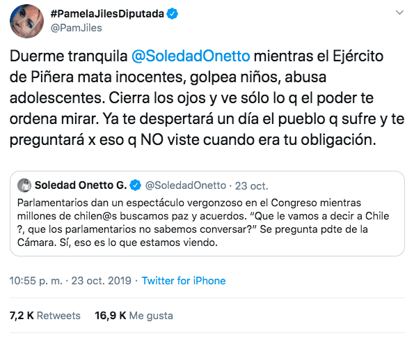 La respuesta de Jiles fue diplomática pero lapidaria: “Duerme tranquila @SoledadOnetto mientras el Ejército de Piñera mata inocentes, golpea niños, abusa adolescentes”.
