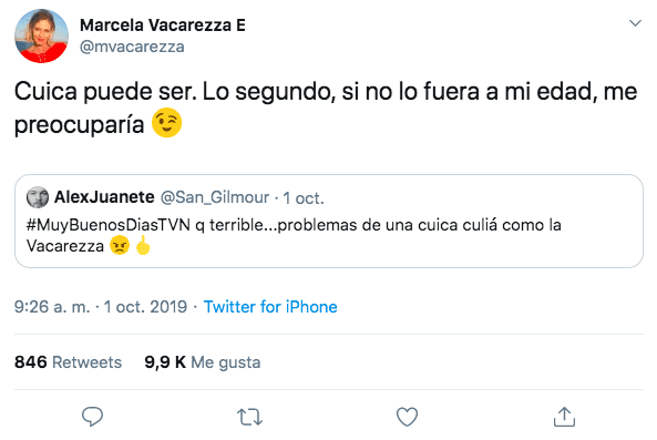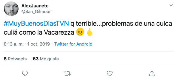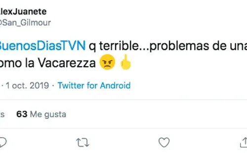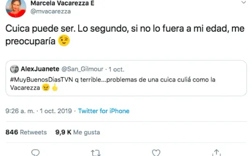 La mañana de este miércoles, un malhumorado tuitero decidió emprenderlas contra la integrante del matinal de TVN “Muy Buenos Días” y utilizó un “recurrente adjetivo” para cuestionar los comentarios poco cercanos a la realidad de la mayoría de los chilenos que hizo Vacarezza.