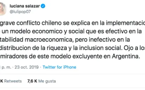 La modelo argentina Luciana Salazar publicó en Twitter un escueto pero certero análisis del modelo socio-económico que llevó a Chile hasta la crisis que se vive desde hace algunos días.
