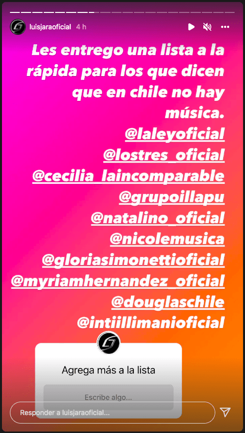 “Ok, la hago corta. Cada vez que voy a comer comida chilena a distintos restaurantes, me encuentro con la sorpresa que en ninguno están escuchando a nuestros artistas”, la mentó por medio de las historias de su Instagram.
