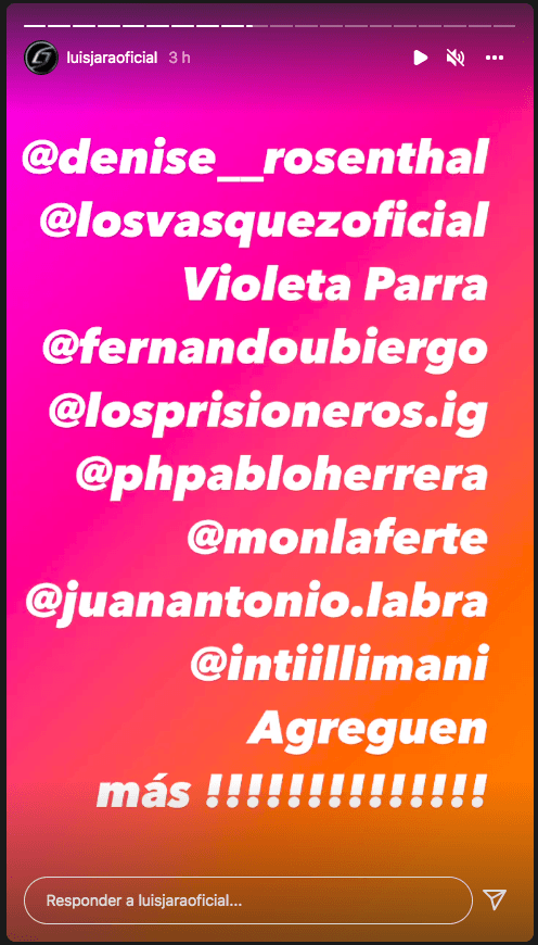 Y en la conclusión de su mensaje le hizo una dedicatoria “a los que dicen que en Chile no hay música”, etiquetando a distintas bandas chilenas como La Ley, Los Tres, Illapu, Cecilia, Nicole y más.