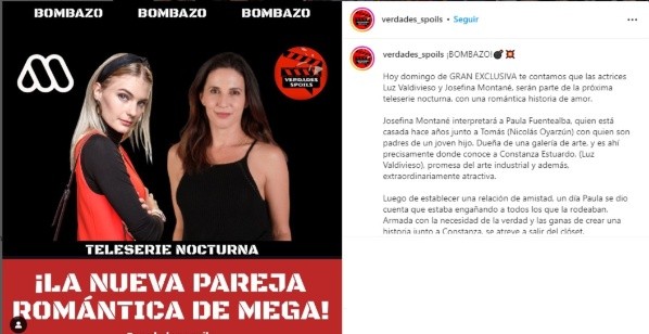 “Hoy domingo de GRAN EXCLUSIVA te contamos que las actrices Luz Valdivieso y Josefina Montané, serán parte de la próxima teleserie nocturna, con una romántica historia de amor”, comenzó señalando la publicación.