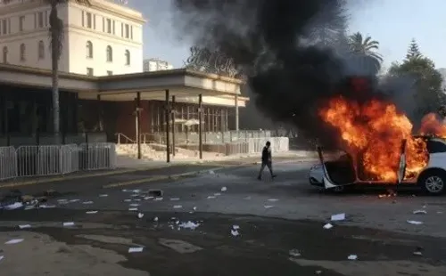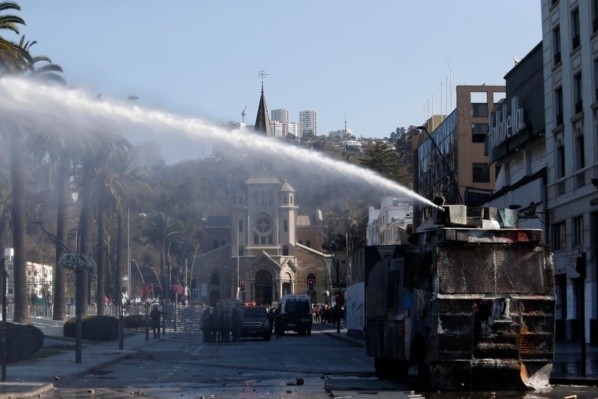 En tanto, otros individuos apedrearon el frontis del Hotel O’Higgins y también activaron extintores en el hall de entrada.