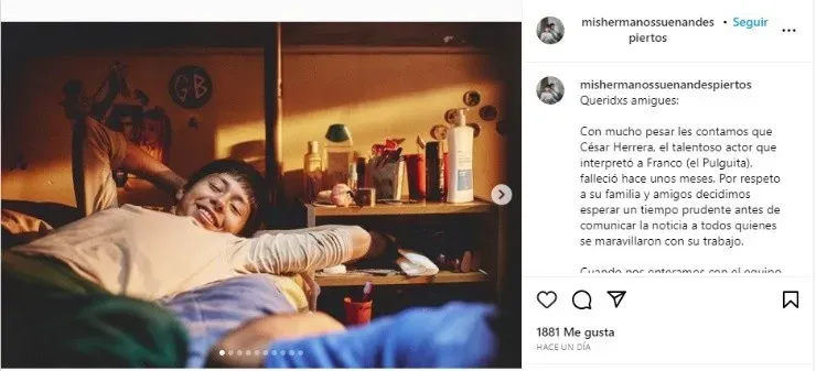 La cuenta oficial de la cinta en Instagram confirmó la noticia con un sentido mensaje. “Con mucho pesar les contamos que César Herrera, el talentoso actor que interpretó a Franco (el Pulguita), falleció hace unos meses. Por respeto a su familia y amigos, decidimos esperar un tiempo prudente antes de comunicar la noticia a todos quienes se maravillaron con su trabajo”.