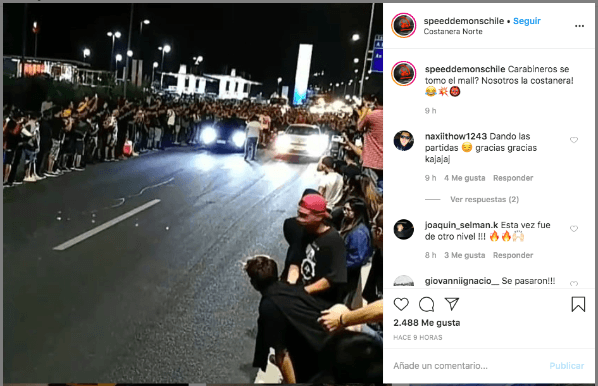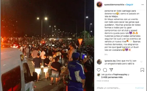 El “evento” fue organizado por la agrupación conocida como SpeedemonsChile, presidida por el hijo de Raquel Argandoña, Hernán “Nano”Calderon, quien se jactó en sus historias de Instagram de haber superado el actuar policial.