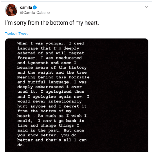 Camila Cabello aseguró que aprovechará su ventana de visibilidad para “hablar sobre la injusticia y la inequidad”, y antes de concluir el mensaje remató: “no hay palabras para explicar lo profundamente arrepentida y avergonzada que me siento, y me disculpo nuevamente desde el fondo de mi corazón”.