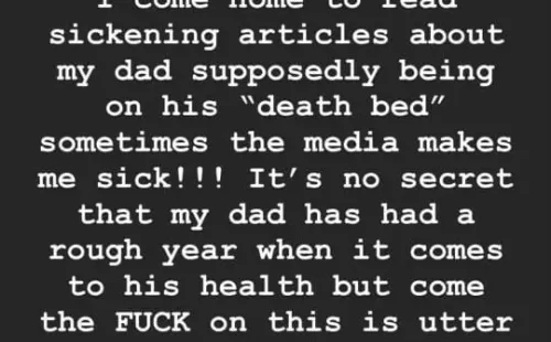 “Llego a mi casa y leo estos artículos nauseabundos sobre que mi padre supuestamente se encuentra ‘en su lecho de muerte’ A veces la prensa me enferma”.
