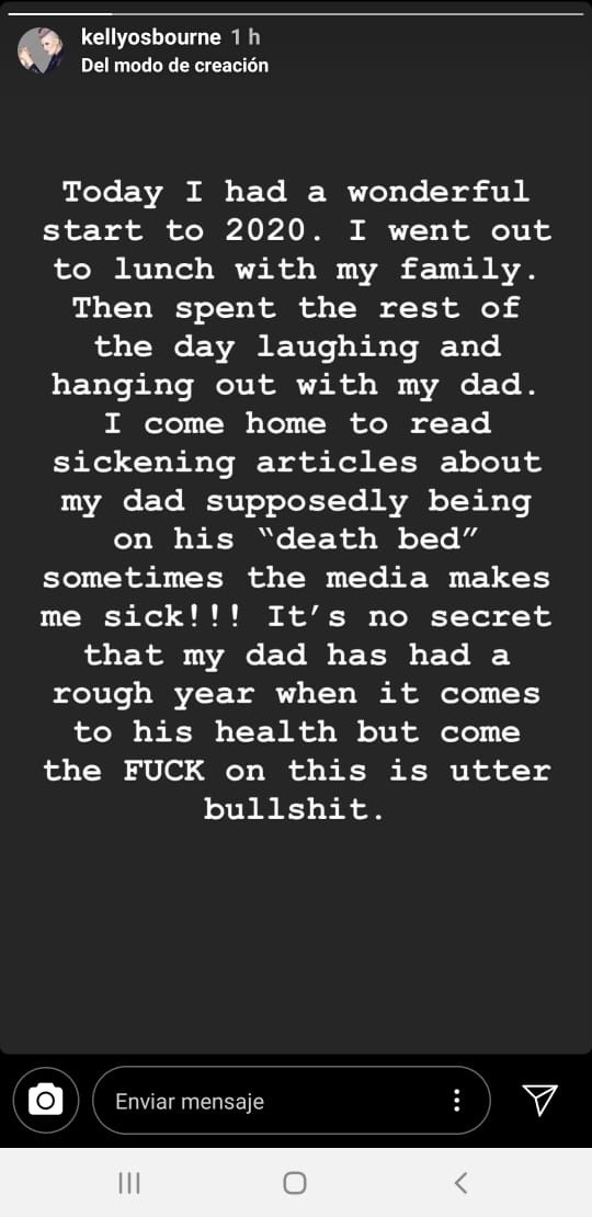 Una indignada Kelly Osbourne también salió a desmentir el reporte publicado este miércoles y que retrataba elsupuesto complejo estado de salud en que se encuentra su padre, ya que prácticamente se encontraba en “su lecho de muerte”.
