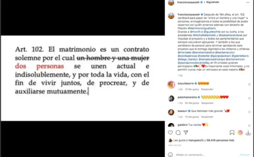 “Después de 164 años, el art. 102 cambiará para pasar de ‘entre un hombre y una mujer’ a personas, entregándonos a todos la posibilidad de poder casarnos con quién amamos además con derecho de filiación #MatrimonioIgualitario”, escribió en Instagram Saavedra al momento de valorar la decisión de los parlamentarios.