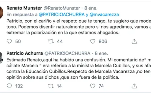 En ese momento, Achurra reaparecióen la red social para entregar explicaciones por la polémica que detonó en los días previos. Por eso, sostuvo que “aquí ha habido una confusión. Mi comentario de’mejor cállate Marcela’era referido a la ministra Marcela Cubillos, y sus afanes contra la Educación”.