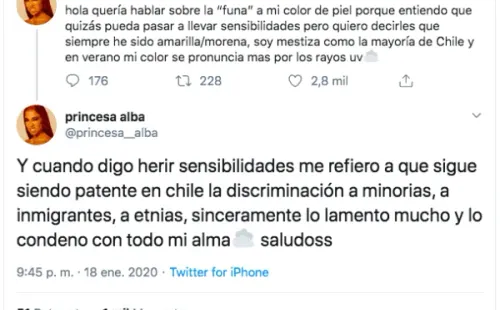 Pero la polémica no se quedó ahí, porque una cuenta en Instagram alimentó la arremetida contra la cantante, publicando una captura de su tuit, pantallazos del video e imágenes que la misma Princesa Alba había compartido en sus redes sociales.