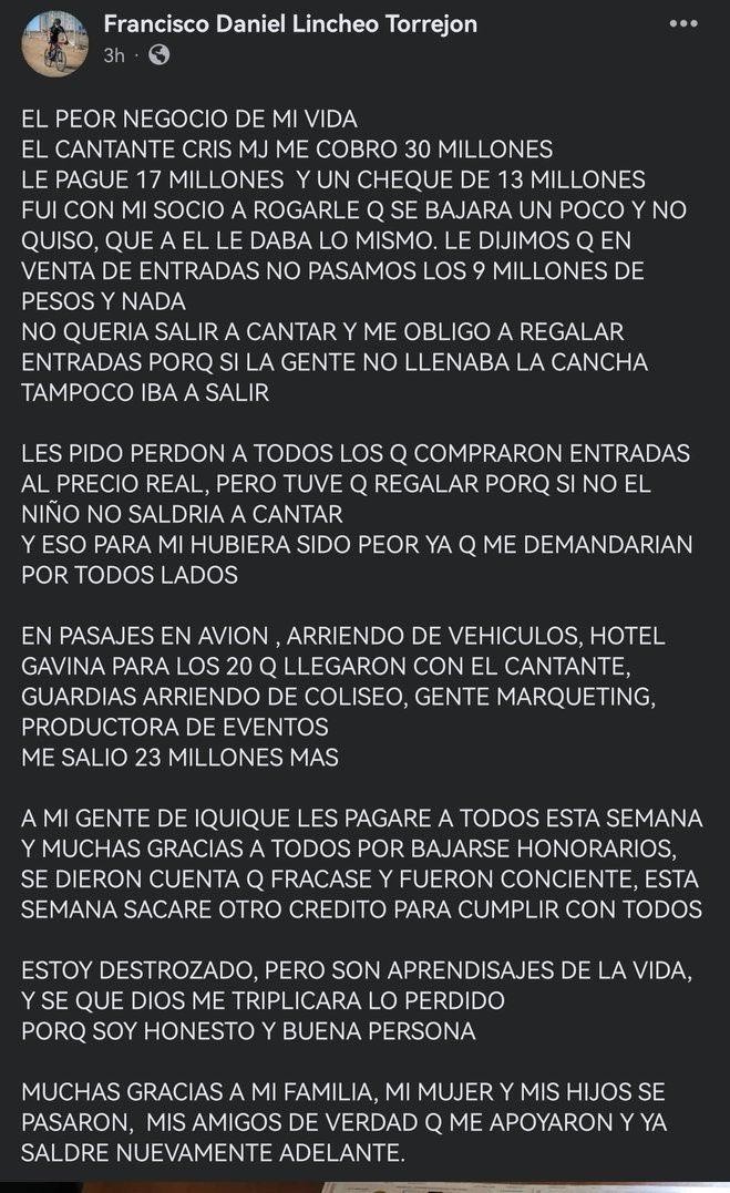 “El peor negocio de mi vida. El cantante Cris MJ me cobró 30 millones, le pagué 17 millones y un cheque de 13 millones. Fui con mi socio a rogarle que se bajara un poco y no quiso, que a él le daba lo mismo. Le dijimos qUE en venta de entradas no pasamos los 9 millones de pesos y nada, no quería salir a cantar y me obligó a regalar entradas porque si la gente no llenaba la cancha tampoco iba a salir”, dijo el productor Francisco Lincheo.