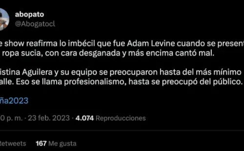 Pero también hubo espacio para las risas, ya que muchos recordaron a Adam Levine y su desafortunada presentación con Maroon 5. Y es que recordado por su pesadez y aires de divo, Christina ha hecho todo lo contrario según los fanáticos, conversando con el público en inglés y aceptando de buena manera la interrupciónde los animadores y la entrega de ambas Gaviotas.