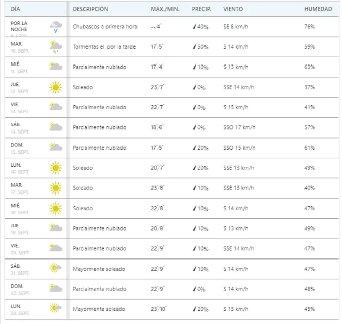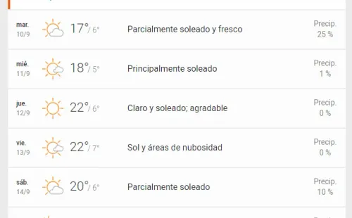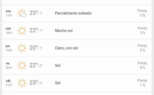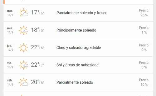 Mientras que The Weather Channel proyecta tormentas eléctricas para la zona central la noche de este martes 10 de septiembre, con temperaturas que aumentarán hasta los 23° el jueves, y cielos despejados. Las mínimas irán entre los 4° a 7° en los próximos días, y descarta nuevas precipitaciones para el fin de semana.