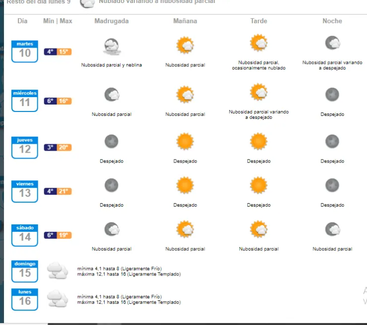 El portal aún no realiza una proyección pensando en Fiestas Patrias, y solo tiene el probable pronóstico para el lunes 16 de septiembre, con cielos nublados y temperaturas de 8° y 16°. Con el correr de los días se actualizará la condición.