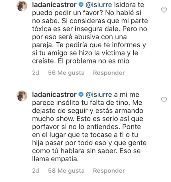 “¿Isidora, te puedo pedir un favor? No hable si no sabe”, le lanzó en uno de los textos. Mientras que en otra respuesta, Castro le recalcó que “me parece insólito tu falta de tino”.