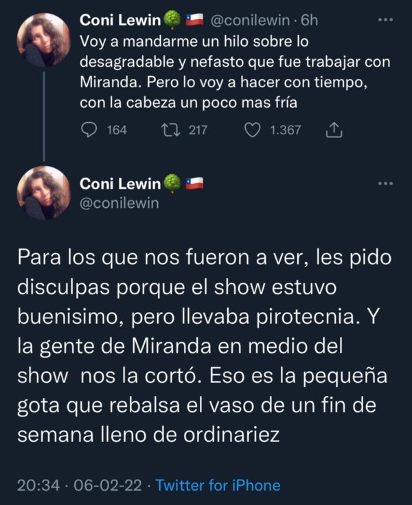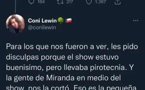 En tanto, luego añadió que “para los que nos fueron a ver, les pido disculpas porque el show estuvo buenisimo, pero llevaba pirotecnia. Y la gente de Miranda en medio del show nos la cortó. Eso es la pequeña gota que rebalsa el vaso de un fin de semana lleno de ordinariez”.