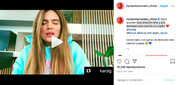 Myriam subió el video a su cuenta de Instagram, donde alabó el homenaje y regalo a su progenitor. “Qué emoción oírte y que le dediques esta canción a tu padre“, escribió la chilena.