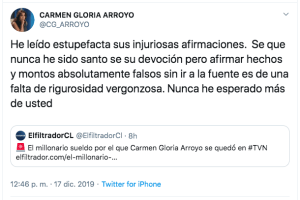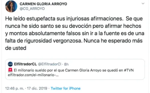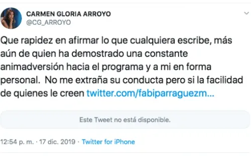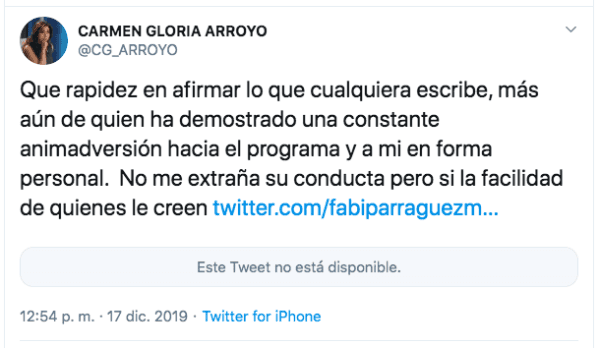 La publicación se hizo este martes y a horas de su salida a la luz, fue la misma Carmen Gloria Arroyo quien salió a desmentir tajantemente la información, cuestionando la rigurosidad con que informa el blog de reportes sobre la televisión.
