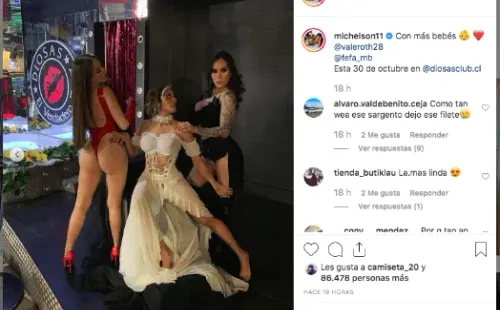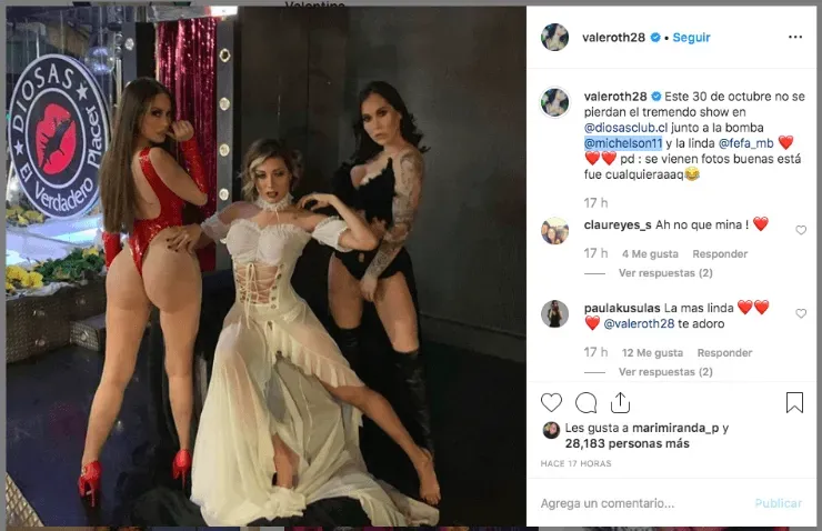 “Este 30 de octubre no se pierdan el tremendo show en@diosasclub.cljunto a la bomba@michelson11y la linda@fefa_mb❤️”, proclamó en su cuenta de Instagram, acompañando una fotografía en que la que también aparecen acompañadas de la bailarina Estefani Meléndez.