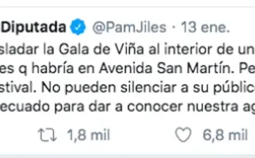 La diputada Pamela Jiles está acostumbra a entregar su parecer sobre distintas temáticas a través de redes sociales. Este lunes fue el turno del Festival de Viña 2020, cuya gala tendrá lugar a puertas cerradas en el Casino de Viña del Mar.
