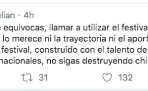 Ya durante la jornada de este martes, Vasco Moulian se enteró de la publicación de Jiles y decidió responderle para refutar su planteamiento. Para el comentarista televisivo: “utilizar el festival para tu causa ‘boicot’no se lo merece ni la trayectoria ni el aporte de sesenta y un años de historia del festival”.