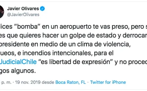 Toda una polémica se desató la semana pasada después de que el ex conductor de “Tremendo Choque”, Javier Olivares, publicó un a tuit cuestionando las decisiones del Poder Judicial chileno, en medio del estallido social.