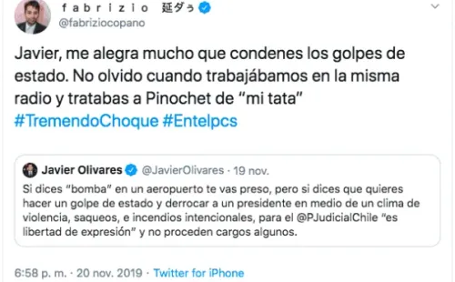Ante lo que cientos de personas reaccionaron, algunos apoyando y otros cuestionando su postura. Desde el segundo grupo emanó Fabrizio Copano, para recordarle una antigua devoción a Olivares, quien proclamaba su admiración por el ex dictador Augusto Pinochet: