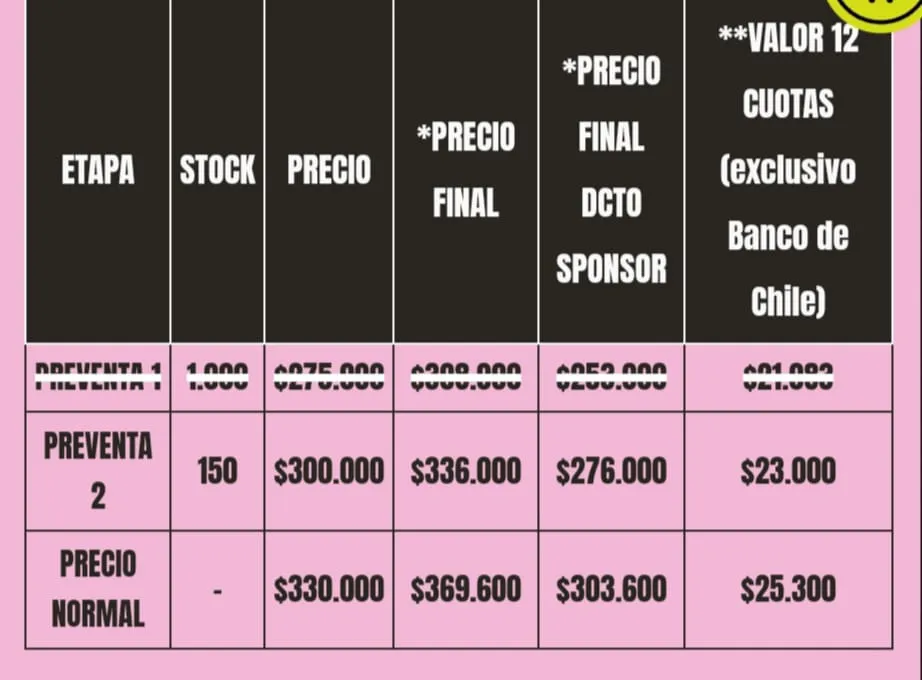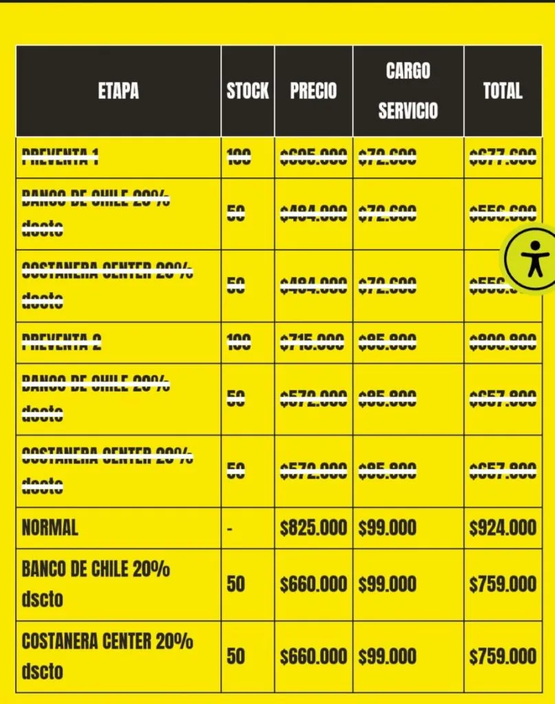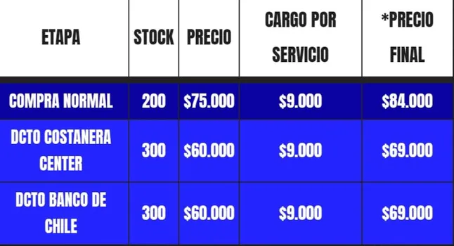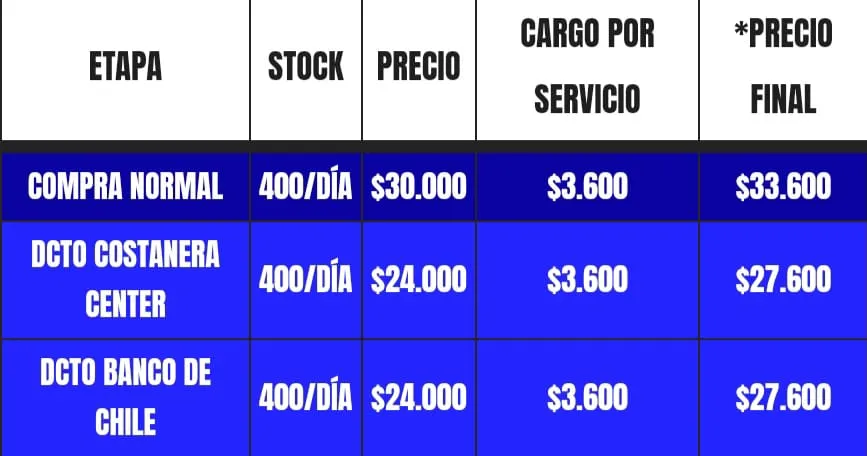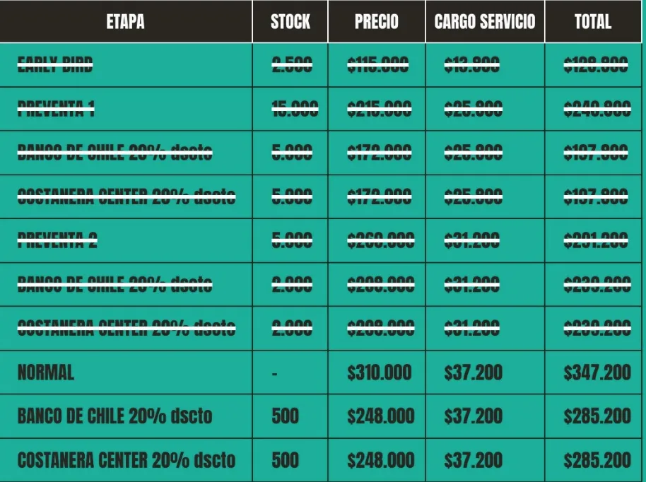 Tal como está señalado, la entrada general tiene un valor sobre los trescientos mil pesos y con el tícket tienes la posibilidad de acceder a las tres jornadas de música en vivo. Por otro lado, para obtener descuento en el valor total, debes cumplir con los requisitos de ser cliente Banco de Chile o cliente Costanera Center.