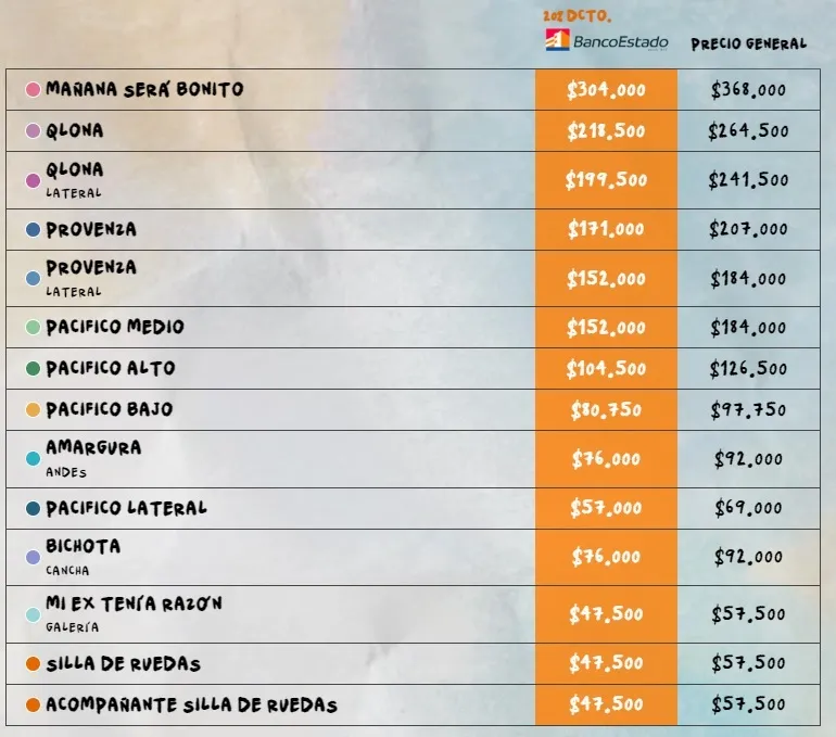 Para disfrutar del espectáculo de esta destacada estrella de la música, se ofrecen diversas ubicaciones con precios variados. Las entradas comienzan desde los 57.500 para la Galería “Mi ex tenía razón”, mientras que la sección Andes, “Amargura”, está valorada en 92.000. La localidad más exclusiva, titulada “Mañana será Bonito”, tiene un precio de $368.000.