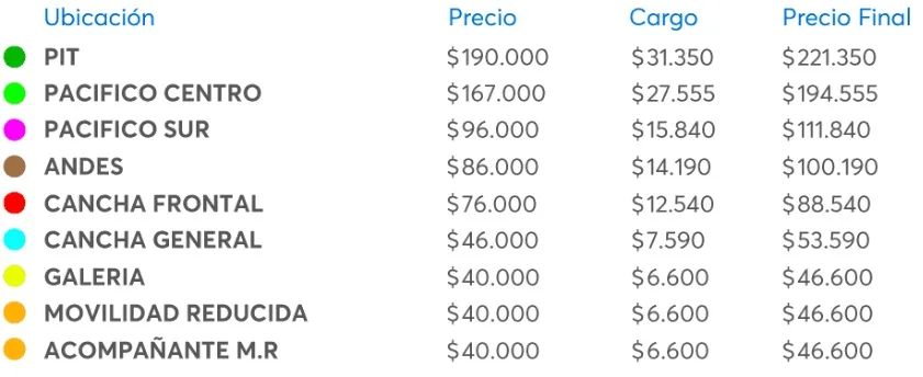Las entradas tienen un valor que van desde los $46.600 con cargo incluido, correspondiente a Galería, hasta los $221.350 con cargo incluido, que es la localidad Pit.