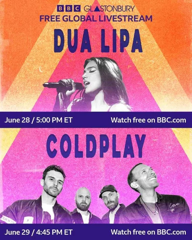 Dua Lipa y Coldplay se presentarán como headliners en el Pyramid Stage durante este fin de semana. El show de Dua Lipa está programada para el día viernes 28 de junio, en la noche, pero en Chile se podrá ver en vivo a partir de las 17:00 horas de la tarde en horario chileno.