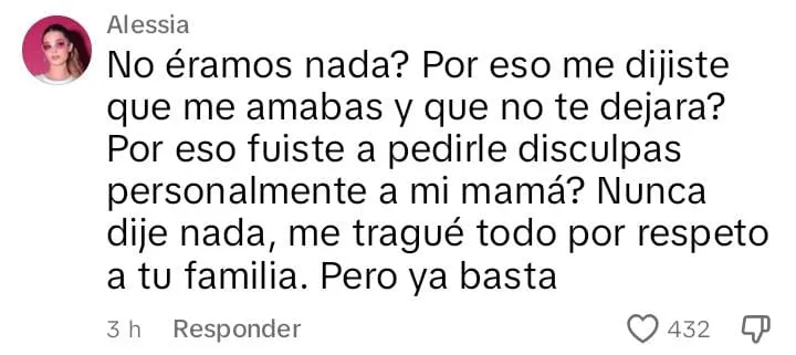 La ex Gran Hermano respondió: “¿No éramos nada? ¿Por eso me dijiste que me amabas y que no te dejara?”, comenzó señalando, para luego agregar: ¿Por eso fuiste a pedirle disculpas personalmente a mi mamá? Nunca dije nada, me tragué todo por respeto a tu familia, pero ya basta”.