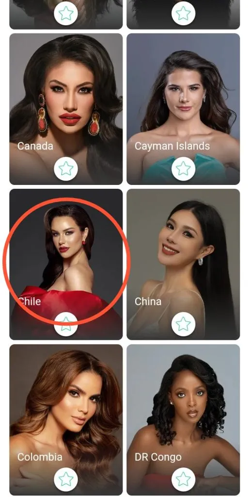 En esa plataforma, encontrarás la lista de candidatas organizada alfabéticamente por país. En el buscador escribe “Emilia Dides” o “Chile” y selecciona su perfil.