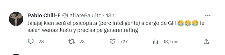 Por su parte, Pablo Chill-E reaccionó a su canción sonando en Gran Hermano, escribiendo en su cuenta de Twitter: “Quién es el psicópata (pero inteligente) a cargo de Gran Hermano. Le salen buenas, justo y preciso para generar rating“.