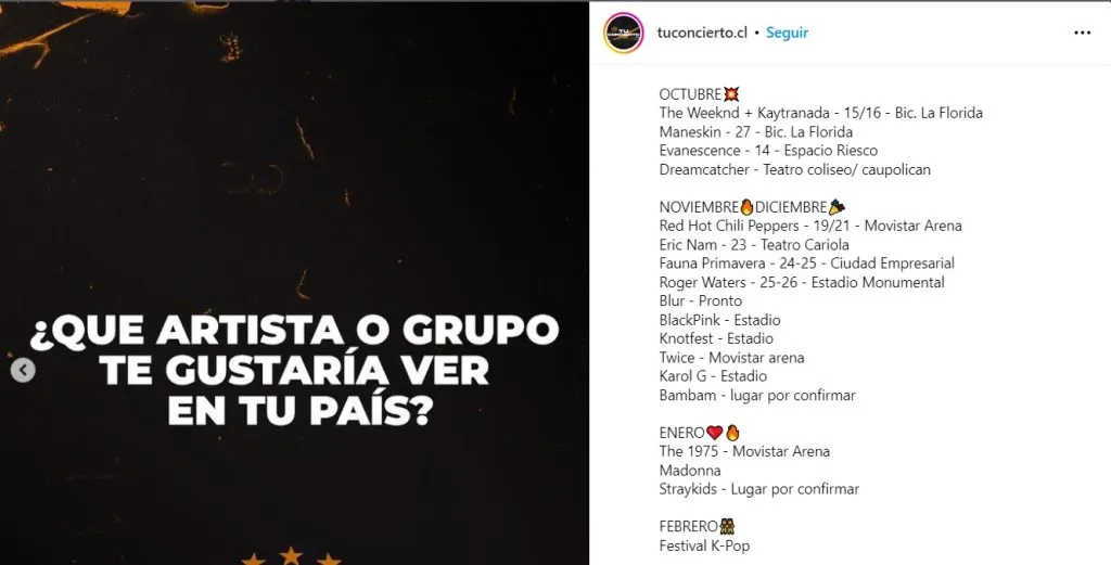 La cuenta Tuconcierto reveló que BLACKPINK podría visitar Chile entre los meses de noviembre o diciembre y se presentaría en el estadio nacional, mientras que Twice, también se presentaría en uno de esos meses, pero en el Movistar Arena.