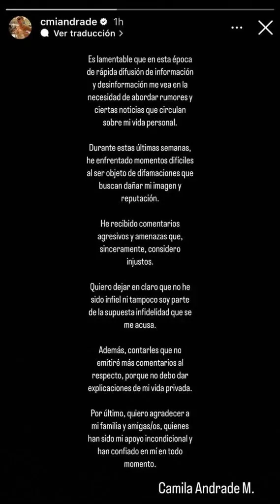 La noche de este miércoles 10 de abril Camila Andrade publicó una historia en su cuenta oficial de Instagram. Con el que sería su primer y único comunicado de la gran polémica, la modelo se refirió a los rumores que la incumben sobre ser infiel.