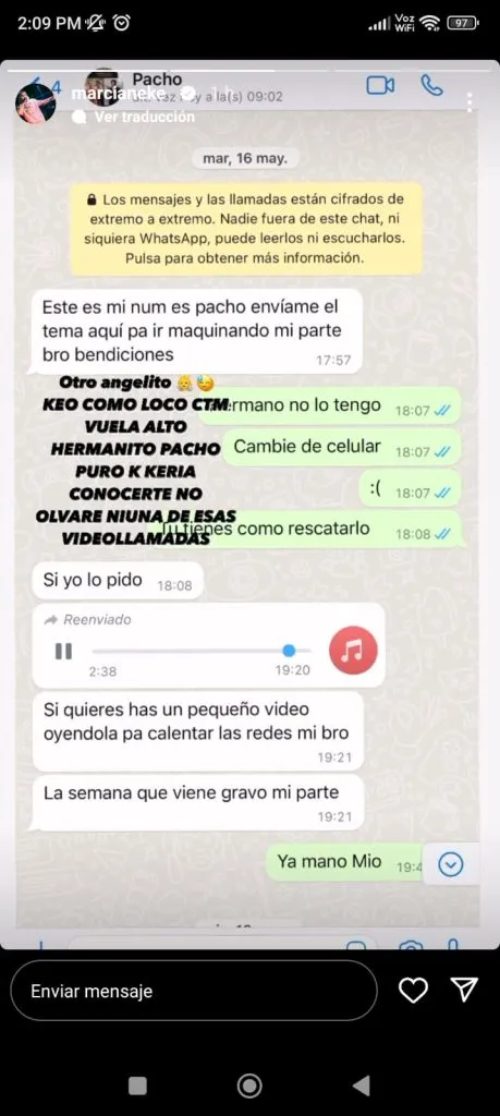 Por el lado de los artistas chilenos, Marcianeke compartió una historia en su Instagram con una conversación que mantuvo con Pacho hace algunos días, el chileno comentó “Otro angelito, keo como loco CTM. Vuela alto hermanito Pacho puro k keria conocerte no olvidare niuna de esas videollamadas”.