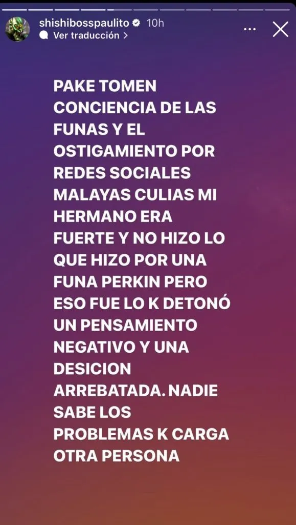 “Tomen conciencia de las funas y el hostigamiento en redes sociales. Mi hermano era fuerte y no lo hizo por una funa perkin, pero eso fue lo que detonó un pensamiento negativo y una decisión arrebata. Nadie sabe los problemas que carga otra persona”, escribió Pablo Chill-E.